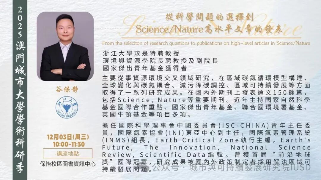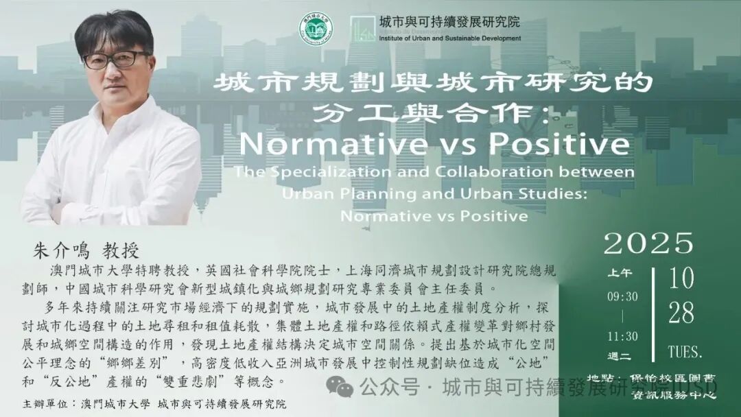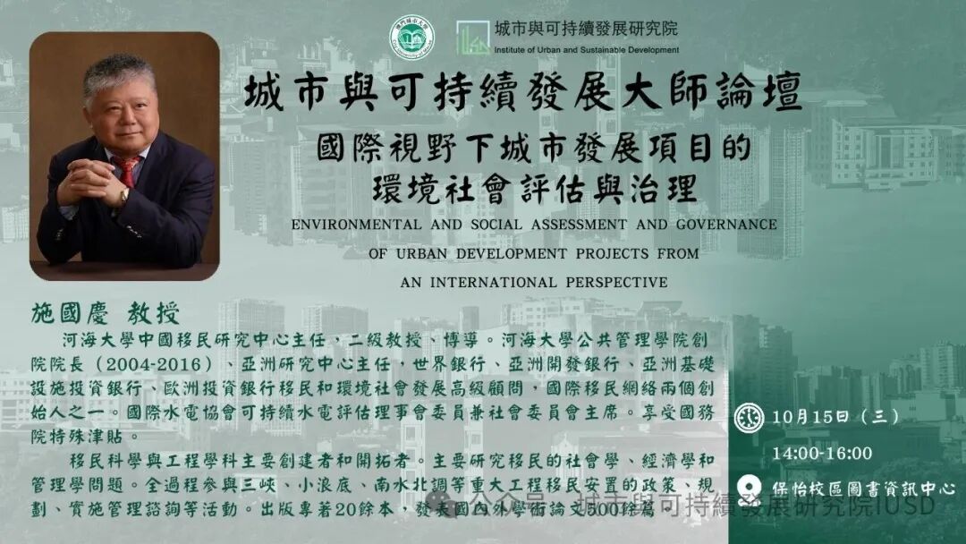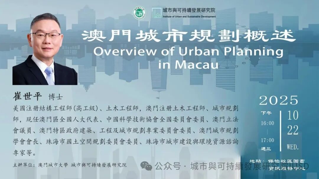 2025年10月,IUSD分別邀請了河海大學施國慶教授, 澳門城市規劃學會會長崔世平博士和同濟大學朱介鳴教授來到學院講座。