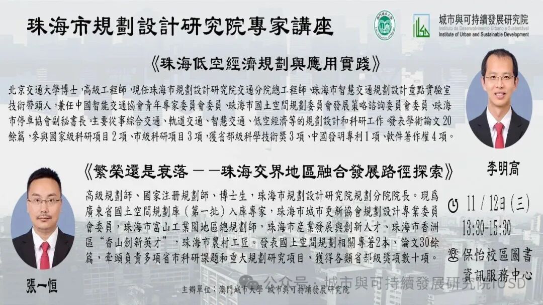 2025年11月,IUSD舉行了兩次學術分享以及兩次講座。兩次學術分享分別由IUSD全職教師謝俊民副教授和黃廣副教授,以及黎斌副教授和楊華傑助理教授组织开展;兩次講座分别邀请珠海市規劃設計院交通分院的李明高總工程師和規劃分院的張一恆院長,以及日本慶應大學的嚴綱林教授。