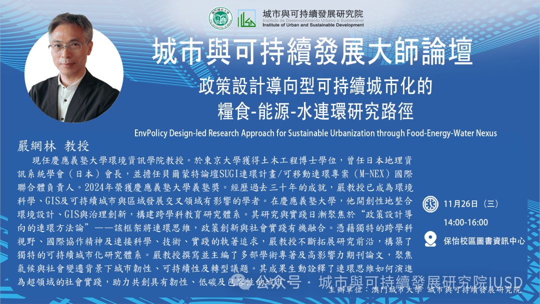 作為環境科學、GIS 與可持續城市發展領域的權威學者,嚴綱林教授結合三十年跨學科研究經驗,闡述了 “政策設計導向的連環方法論” 框架 —— 將糧食 - 能源 - 水(FEW)連環思維、政策創新與社會實踐深度融合,並以貝爾蒙特論壇 SUGI 連環計畫等國際項目為例,解讀如何通過 GIS 技術、跨學科協作,構建兼具韌性、低碳與包容性的可持續城市。本次講座嚴教授的分享為澳門及區域可持續城市化提供了創新視角與實踐參考,也進一步強化了澳門城市大學在跨學科研究與國際學術交流領域的連結。